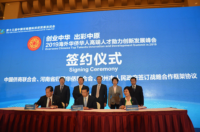 活動(dòng)最后舉行了簽約儀式,中國(guó)僑商會(huì)、河南省僑聯(lián)、鄭州市人民政府簽訂戰(zhàn)略合作框架協(xié)議,萬立駿等領(lǐng)導(dǎo)上臺(tái)見證。