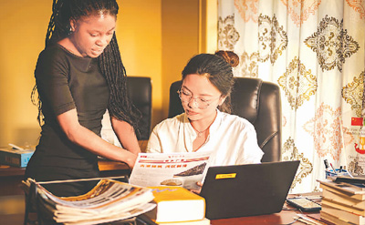 《非洲華僑周報(bào)》贊比亞分社編輯劉歡(右)和同事在值夜班。�。细绻﹫D)