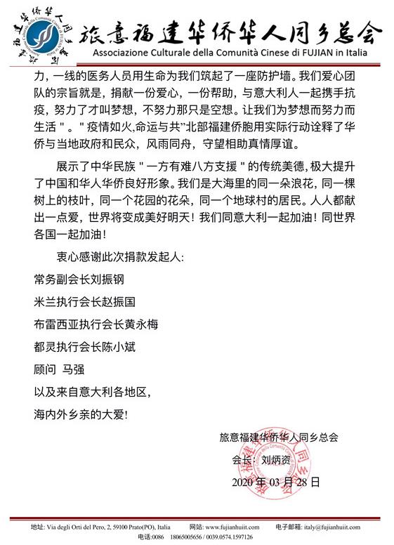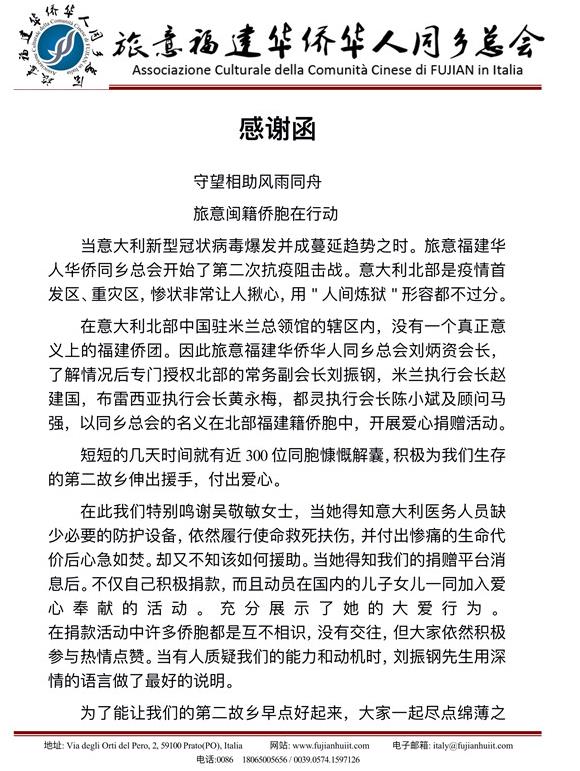 意大利北部是疫情首發(fā)區(qū)、重災(zāi)區(qū),旅意福建華僑華?同鄉(xiāng)總會劉炳資會長了解到,中國駐米蘭總領(lǐng)館轄區(qū)內(nèi)沒有一個真正意義上的福建僑團,專門授權(quán)常務(wù)副會長劉振鋼、米蘭執(zhí)行會長趙建國、布雷西亞執(zhí)行會長黃永梅、都靈執(zhí)行會長陳小斌及顧問馬強,以同鄉(xiāng)總會的名義,在北部福建籍僑胞中開展愛心捐贈活動。