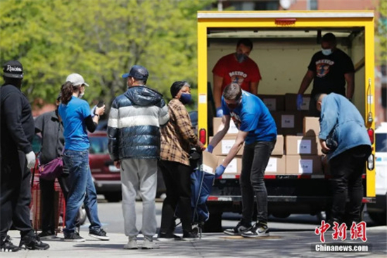 資料圖:一個公益組織在紐約市皇后區(qū)一個居民區(qū)發(fā)放免費的500份餐食,民眾排隊領取。疫情期間,紐約市公立學校等地點都會有免費餐食發(fā)放。中新社記者 廖攀 攝