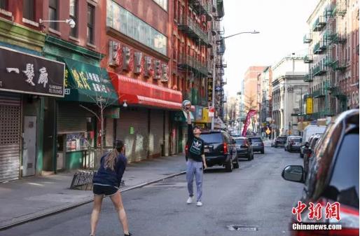 疫情下的紐約唐人街,受新冠肺炎疫情影響,平日喧囂的紐約曼哈頓唐人街車輛稀少,仍有年輕人在街頭運動。(中新社記者 廖攀 攝)