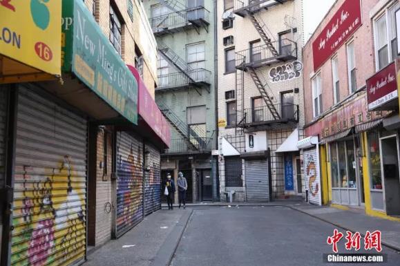 受新冠肺炎疫情影響,平日喧囂的紐約曼哈頓唐人街商鋪大門緊閉,行人稀少。(中新社記者 廖攀 攝)
