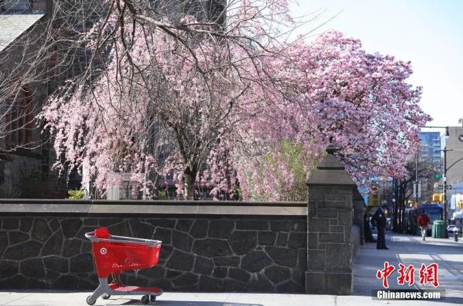當(dāng)?shù)貢r間4月6日,紐約法拉盛華人社區(qū),緬街路旁櫻花盛開。