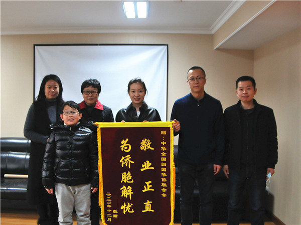 12月17日上午,在浙江投資經(jīng)商的荷蘭僑胞胡某的女兒胡女士帶著孩子,專程從杭州趕到北京,將一面印有“敬業(yè)正直 為僑胞解憂”字樣的錦旗送到中國僑聯(lián),以感謝權(quán)益保障部對胡某反映案件的關(guān)注和推動(dòng)。胡女士表示,她代表父親胡某及家人向權(quán)益保障部提供的及時(shí)、有效法律幫助表達(dá)最誠摯的謝意,僑聯(lián)不愧是歸僑僑眷和海外僑胞的“貼心人”和“娘家人”。