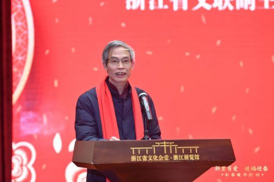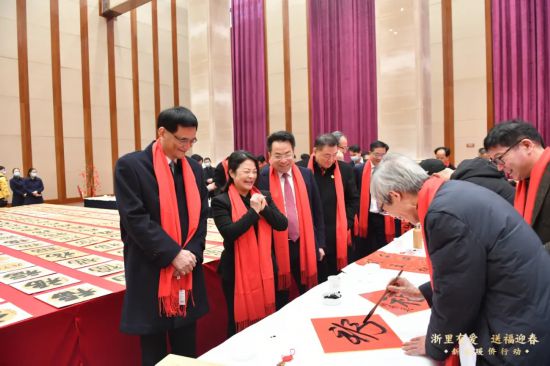 省書法家協(xié)會主席趙雁君在致辭中表示,今天我們在這里聯(lián)合舉辦浙江關(guān)愛海外僑胞和留學(xué)生“寫福、曬福、送福、祈�!被顒樱捌谝呀M織了30多位知名書法家創(chuàng)作了一幅幅福字,由社會各界慈善人士愛心認(rèn)領(lǐng),所得款項將悉數(shù)用于慰問海外浙籍僑胞和留學(xué)生。今天又有20位書法家來到現(xiàn)場揮毫潑墨。作為書法工作者,我們深感藝術(shù)工作的價值與意義,我們希望通過這一個個福字的傳送,表達(dá)浙江書法家的祝福,將“中國�!背蔀椤笆澜绺!�。