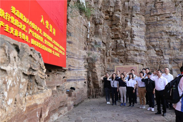 在紅旗渠難度最大的地段——青年洞前,支部書(shū)記陳邁同志帶領(lǐng)全體黨員重溫入黨誓詞。