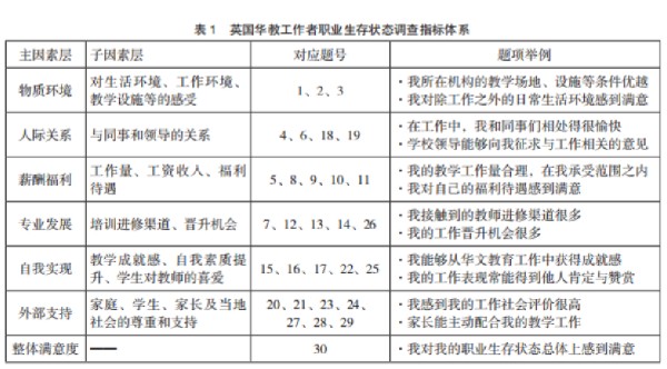 關(guān)于華文教育工作者職業(yè)生存狀態(tài)的研究路向及內(nèi)涵,現(xiàn)有的研究主要包括:第一,單維度取向,即僅僅關(guān)注中文教師物質(zhì)方面的薪酬待遇問(wèn)題,或者僅關(guān)注專(zhuān)業(yè)發(fā)展問(wèn)題;第二,雙維度取向,即不但關(guān)注物質(zhì)維度的問(wèn)題,還同時(shí)關(guān)注中文教師的情感體驗(yàn)方面的問(wèn)題,如職業(yè)倦怠、教學(xué)效能感、身份認(rèn)同等等;第三,多維度取向,即關(guān)注華文教育從業(yè)者的薪酬待遇、專(zhuān)業(yè)發(fā)展、情感體驗(yàn)、身心狀態(tài)等多個(gè)方面。鑒于對(duì)華文教育工作者職業(yè)生存狀態(tài)復(fù)雜性的認(rèn)識(shí)日益加深,多維度研究逐漸成為主流,故本研究采取這一研究路向。