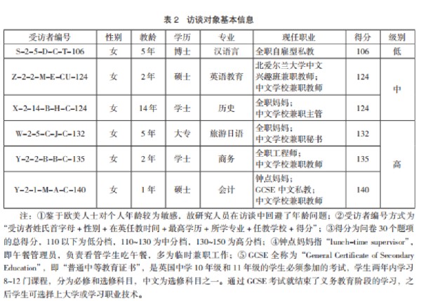 研究人員于2019年底至2020年初陸續(xù)對(duì)受訪(fǎng)者進(jìn)行面對(duì)面訪(fǎng)談和微信語(yǔ)音訪(fǎng)談,重點(diǎn)了解英國(guó)華教工作者在六個(gè)維度上的感受,以及從教動(dòng)機(jī)、對(duì)英國(guó)華文教育未來(lái)發(fā)展的看法、個(gè)人繼續(xù)從教意愿以及職業(yè)發(fā)展規(guī)劃等。每次訪(fǎng)談時(shí)間為45~90分鐘,訪(fǎng)談內(nèi)容后被整理為3 萬(wàn)多的文字資料。