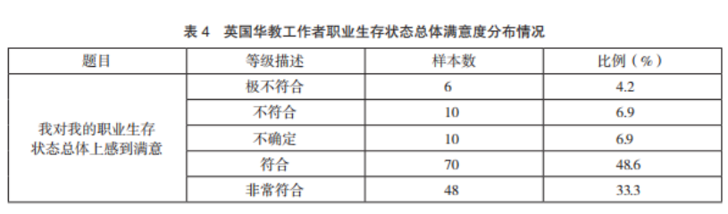 在對(duì)試測(cè)樣本進(jìn)行分析后,研究人員對(duì)問(wèn)卷題目做了進(jìn)一步的刪減與微調(diào)。正式問(wèn)卷題目共30道,滿(mǎn)分150分,涉及職業(yè)生存狀態(tài)的整體水平及各個(gè)子維度水平的調(diào)查。隨后根據(jù)目的性取樣和便利性取樣原則,在2018 年底至2019 年上半年利用網(wǎng)絡(luò)調(diào)查方式,將問(wèn)卷發(fā)放到各地的英國(guó)華文教師微信群、教師論壇等交流平臺(tái),并通過(guò)網(wǎng)絡(luò)搜索英國(guó)各地華文學(xué)校聯(lián)系郵箱發(fā)放問(wèn)卷。最終回收問(wèn)卷176份,其中有效問(wèn)卷144份,有效率81.8%。正式問(wèn)卷信度值為0.95,效度值為0.875,問(wèn)卷的信效度較高。問(wèn)卷回收后,采用SPSS20軟件對(duì)數(shù)據(jù)進(jìn)行分析。