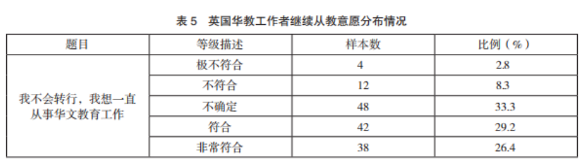 繼續(xù)從教意愿的均值為3.68,略高于中值3,具體選擇分布如表5所示。受訪(fǎng)者中僅有半數(shù)人具有較高的職業(yè)忠誠(chéng)度;三分之一的人仍處在搖擺狀態(tài),對(duì)未來(lái)發(fā)展不夠明朗;而十分之一的人離職意愿強(qiáng)烈。因此,如何爭(zhēng)取搖擺狀態(tài)的人?如何減少離職率?這是英國(guó)華文教育可持續(xù)發(fā)展不可回避的問(wèn)題。