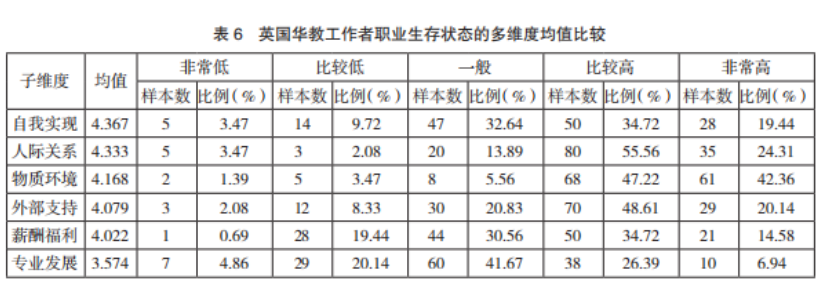 把各個(gè)題項(xiàng)分為六個(gè)維度進(jìn)行統(tǒng)計(jì)整理,可以揭示華教工作者職業(yè)生存狀態(tài)的不同側(cè)面。如表6所示,調(diào)查對(duì)象職業(yè)生存狀態(tài)各維度均值由高到低依次是:自我實(shí)現(xiàn)>人際關(guān)系>物質(zhì)環(huán)境>外部支持>薪酬福利>專(zhuān)業(yè)發(fā)展。其中,受訪(fǎng)者對(duì)“自我實(shí)現(xiàn)”滿(mǎn)意度最高,表明華文教育工作在很大程度上促進(jìn)了受訪(fǎng)者自我價(jià)值的實(shí)現(xiàn),其工作得到了學(xué)生、家長(zhǎng)、家人、當(dāng)?shù)孛癖姷恼J(rèn)可。相反,受訪(fǎng)者對(duì)“專(zhuān)業(yè)發(fā)展”的滿(mǎn)意度最低,說(shuō)明他們接受再教育、再學(xué)習(xí)的意識(shí)強(qiáng)烈,但培訓(xùn)進(jìn)修、晉級(jí)升等的渠道有限,專(zhuān)業(yè)發(fā)展遭遇“天花板”。