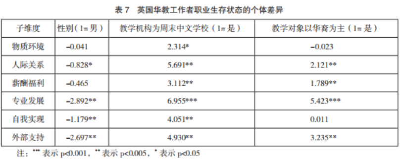 經(jīng)過(guò)均值比較發(fā)現(xiàn),英國(guó)華教工作者的職業(yè)生存狀態(tài)主要在性別、任教機(jī)構(gòu)和教學(xué)對(duì)象等方面存在顯著性差異(P<0.05),如表7所示:第一,男性從業(yè)者各維度的職業(yè)生存狀態(tài)的得分均低于女性,且“人際關(guān)系”“專(zhuān)業(yè)發(fā)展”“自我實(shí)現(xiàn)”與“外部支持”子維度在性別方面差異顯著;第二,不同任教機(jī)構(gòu)和教學(xué)對(duì)象的從業(yè)者存在顯著差異,就職于周末中文學(xué)校的從業(yè)者在各維度的職業(yè)生存狀態(tài)得分都高于在其他機(jī)構(gòu)工作的同行;第三,以華裔學(xué)生 為主要教學(xué)對(duì)象的從業(yè)者在“人際關(guān)系”“薪酬福利”“專(zhuān)業(yè)發(fā)展”“外部支持”子維度的得分要明顯高于以非華裔為主要教學(xué)對(duì)象的從業(yè)者。