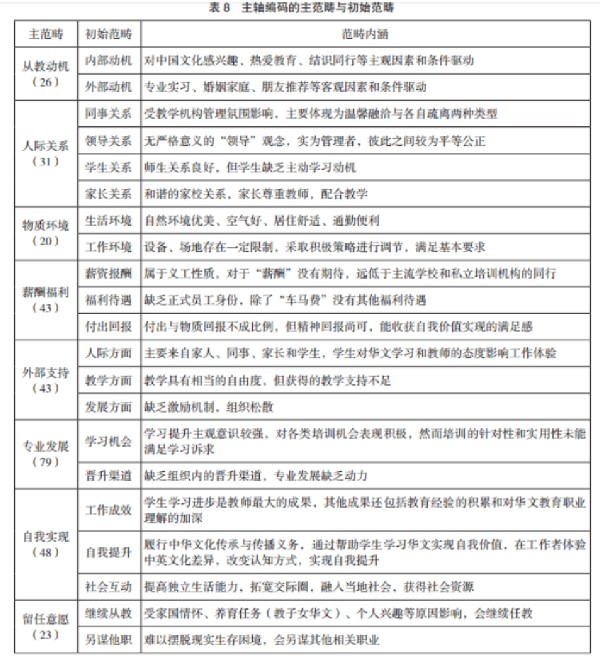 確定初始范疇之后,研究人員根據(jù)主軸編碼原則對(duì)21個(gè)初始范疇的相互關(guān)系和邏輯次序進(jìn)行梳理,得出“從教動(dòng)機(jī)”“人際關(guān)系”等8個(gè)主范疇,詳見(jiàn)表8,括號(hào)中為自由節(jié)點(diǎn)數(shù)。