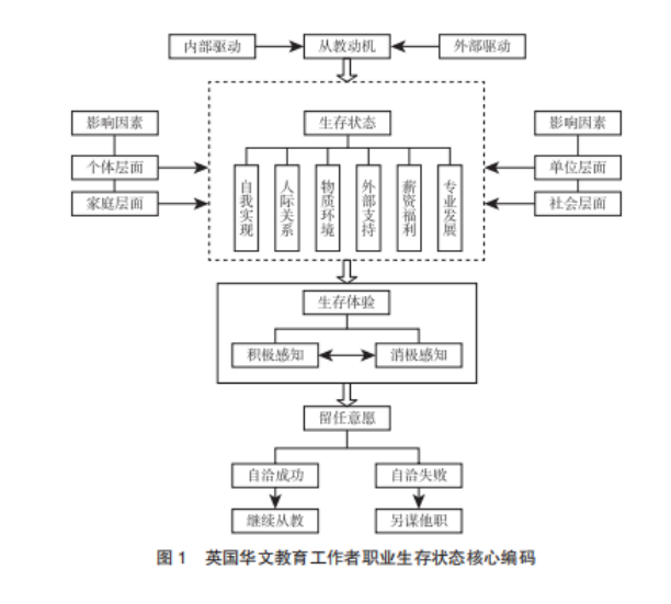 此“故事線(xiàn)”可以概括為:英國(guó)的華教工作者最初受到內(nèi)部和外部的多種因素驅(qū)動(dòng)決定從教,在他們進(jìn)入華文教育職場(chǎng)后,來(lái)自個(gè)體、家庭、單位和社會(huì)四個(gè)層面的影響貫穿其職業(yè)生涯,決定著他們?cè)谌A教職場(chǎng)的職業(yè)生存狀態(tài),繼而影響其職業(yè)生存體驗(yàn),其中既有積極感知(如物質(zhì)環(huán)境優(yōu)渥、人際關(guān)系和諧、傳承中華文化的自豪感、學(xué)生進(jìn)步的成就感等),也有消極感知(如待遇低下、身份模糊、前途迷茫等),并且兩種相互矛盾的感知一直處于此消彼長(zhǎng)變動(dòng)不居的狀態(tài),當(dāng)他們能夠邏輯自洽成功時(shí),會(huì)選擇繼續(xù)從教,否則就可能會(huì)離開(kāi)華教職場(chǎng),另謀他職。