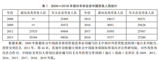 安哥拉是撒哈拉以南非洲第三大經(jīng)濟(jì)體、中國(guó)第三大石油供應(yīng)國(guó)、在非洲的第二大貿(mào)易伙伴和重要工程承包市場(chǎng)。2002年安哥拉內(nèi)戰(zhàn)結(jié)束之前,安哥拉中國(guó)移民數(shù)量長(zhǎng)期徘徊在250~550 人之間。中國(guó)人大規(guī)模進(jìn)入始于2004 年中國(guó)與安哥拉達(dá)成以“石油換貸款”為內(nèi)容和特色的兩國(guó)合作的“安哥拉模式”之后,此后數(shù)量持續(xù)快速增長(zhǎng)。2012—2014 年間達(dá)到峰值約26 萬人,僅次于南非(約30萬人),當(dāng)時(shí)安哥拉全國(guó)總?cè)丝诩s2000萬,相當(dāng)于每百人中就有1名中國(guó)人;2015年開始在安中國(guó)人大量回國(guó),數(shù)量下降了40%~50%;截止到2019年底,僅剩6萬~8萬人,減少了近70%,居南非(約30萬)、尼日利亞(約20萬)之后。中資企業(yè)承建的工程停工、安哥拉經(jīng)營(yíng)環(huán)境及社會(huì)治安持續(xù)惡化是中國(guó)新移民回流的主要原因。