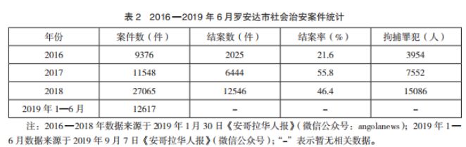 2014年下半年,因國(guó)際油價(jià)暴跌,安哥拉經(jīng)濟(jì)陷入困境,2016年以后GDP曾連續(xù)三年負(fù)增長(zhǎng),失業(yè)率多年在28%的高位徘徊,15~24歲青年群體失業(yè)率更是高達(dá)52.4%。嚴(yán)重的社會(huì)不平等和高貧困率導(dǎo)致暴力犯罪成為在安外國(guó)人面臨的最大安全威脅,被不明武裝人員搶劫司空見慣。以羅安達(dá)市為例,2016年至2019年上半年,治安案件大幅上升(見表2)。