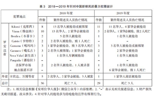 “在安哥拉,一定要‘安’字當(dāng)頭”,這是筆者在田野調(diào)查期間聽到中國(guó)新移民說得最多的一句話。筆者統(tǒng)計(jì)了《安哥拉華人報(bào)》(微信公眾號(hào))推送的近兩年針對(duì)中國(guó)新移民的暴力犯罪(見表3),發(fā)現(xiàn)中國(guó)新移民面臨的安全形勢(shì)復(fù)雜且嚴(yán)峻。
