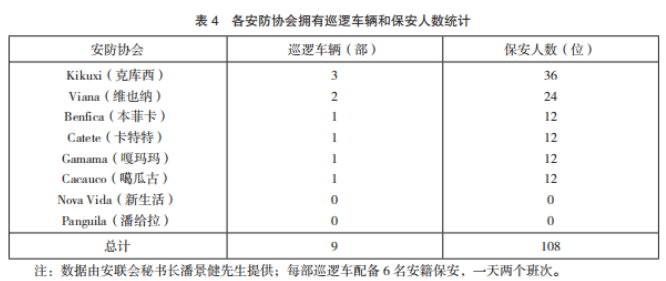 截至2019年6月,各安防協(xié)會(huì)已正常運(yùn)營(yíng)5年,實(shí)力不斷壯大(巡邏車輛及保安人數(shù)統(tǒng)計(jì)見表4)。雖然Nova Vida(新生活)、Panguila(潘給拉)兩處安防協(xié)會(huì)沒有專門巡邏車輛及專職保安隊(duì)伍,但中國(guó)新移民如果在該區(qū)域發(fā)生安全事故向安防協(xié)會(huì)求助,這兩處安防協(xié)會(huì)所依附的華企會(huì)動(dòng)用企業(yè)的車輛和保安前往救援。