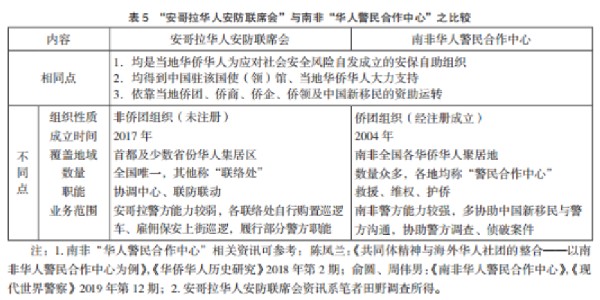 安聯(lián)會(huì)借鑒了同處非洲大陸的南非華僑華人創(chuàng)設(shè)“華人警民合作中心”的成功經(jīng)驗(yàn),二者在維護(hù)華僑華人安全方面有頗多相似之處,但安哥拉的國(guó)情、僑情與南非有較大不同,安聯(lián)會(huì)成立時(shí)間較晚,其組織架構(gòu)、機(jī)構(gòu)職能、覆蓋范圍等具有諸多安哥拉特色,更符合安哥拉的社會(huì)安全實(shí)際(二者比較見表5)。