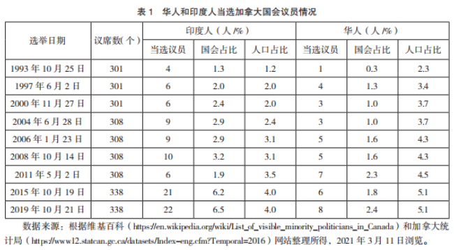 政治參與是移民政治社會化行為的集中體現(xiàn),反映其介入居住國國家政治的行動意向和實際效果。華人和印度人是當(dāng)今加拿大第一和第二大少數(shù)族裔(Visible Minority)。2016 年,加拿大華人人口達(dá)176.9 萬,占總?cè)丝诘?.1%;印度人人口為137.5 萬,占總?cè)丝诘?%。隨著族裔力量的增強(qiáng),他們在政治上日漸活躍。但就選舉參與狀況看,印度人參政成效明顯高于華人,二者在代表權(quán)上的鴻溝愈發(fā)明顯。因此,社會經(jīng)濟(jì)地位上有著諸多相似的兩個族群,政治融入進(jìn)程為何存在明顯差異,成為一個值得探究的話題。