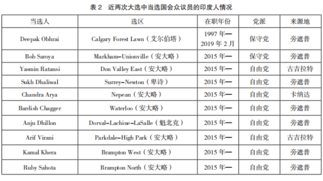 首先,當(dāng)選人數(shù)創(chuàng)歷史新高,二者“代表權(quán)鴻溝”凸顯。2015年,有21名印度人當(dāng)選國會議員,占少數(shù)族裔議員總數(shù)的45%和全部國會席位的6.2%。2019年,當(dāng)選人數(shù)增至22名,占國會席位的6.5%,呈現(xiàn)“超比例代表權(quán)”的特征(見表2)。其中,4 位被提名為部長,職位最高的當(dāng)屬國防部長石�。℉arjit Sajjan)。華人也積極投身于選舉之中,2019年,有8名候選人當(dāng)選,較上屆多出2人,創(chuàng)造了華人參政的新紀(jì)錄。與以往相比,華人參政出現(xiàn)可喜變化。然而,華人參政水平與其人口規(guī)模和經(jīng)濟(jì)實力仍不相稱,如果按人口比例計算,加拿大國會中至少應(yīng)有17名華人議員,目前連一半都不到�!皟�(nèi)閣中偶爾涌現(xiàn)的個別華人部長,多是政黨勝出的大勢和內(nèi)閣多元比例要求的結(jié)果,在邊緣化位置上難以有所作為�!�