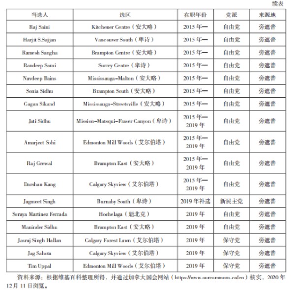 再次,參選失敗率較高,參政群體分布不均衡。雖然華人和印度人參政熱情不斷高漲,參選人數(shù)屢創(chuàng)新高,但是,參選落敗的比例遠(yuǎn)高于成功當(dāng)選的比例。在最近兩次大選中,華人參選失敗率約為80%,印度人亦有70%~75%,這與參選人集中在族裔人口聚集的選區(qū)不無關(guān)系。在華人和印度人次群體中,中國香港移民和印度旁遮普邦的錫克人參政成效明顯。在當(dāng)選華人中,一半為香港移民,而占全加總?cè)丝趦H1.4%的錫克人獲得了19個國會席位和3個內(nèi)閣職位。中國大陸新移民和印度古吉拉特邦的參選人數(shù)亦有增加,但成功者僅3位,分別是董晗鵬、阿里夫·維拉尼(Arif Virani)和亞斯名·拉坦西(Yasmin Ratansi)。