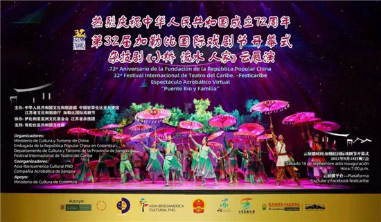 9月18日晚黃金時(shí)間,中國駐哥倫比亞大使館和哥倫比亞文化部,聯(lián)合在哥倫比亞國家電視臺(tái)、第32屆加勒比國際戲劇節(jié)開幕式上,共同舉辦“江蘇省華僑文化交流基地”江蘇省雜技團(tuán)創(chuàng)作的雜技劇《小橋流水人家》國慶系列云首演,掀開了中華人民共和國成立72周年暨中哥建交41周年系列獻(xiàn)禮活動(dòng)。CGTN西班牙語部、中國文化網(wǎng)等中哥機(jī)構(gòu)和媒體的電視端、官網(wǎng)及YouTube、Facebook等新媒體賬號同步播出。中哥各界民眾與加勒比地區(qū)26萬觀眾和粉絲,歡聚云中,好評如潮。