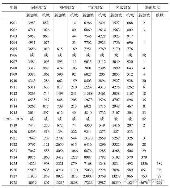 1929~1933年世界經(jīng)濟(jì)危機(jī)重挫了馬來(lái)亞經(jīng)濟(jì),引發(fā)企業(yè)倒閉和失業(yè)狂潮,導(dǎo)致英國(guó)殖民當(dāng)局改變移民政策。1929年以前,殖民當(dāng)局對(duì)移民基本沒有任何限制,1930年殖民當(dāng)局宣布《移民限制法令》(Immigration Restriction Ordinance),規(guī)定從1930年8月1日起對(duì)進(jìn)入殖民地的男性新移民進(jìn)行名額限制,1933年4月1日殖民當(dāng)局頒布《外僑法令》(Aliens Ordinance)代替《移民限制法令》,根據(jù)經(jīng)濟(jì)情況和勞動(dòng)力需求,隨時(shí)調(diào)整移民限額。受此法令影響,華人男性在1930年8月至1938年4月1日每月移民限額在1000~6000人之間變化。(1)19這些移民法令限制的是新客,對(duì)老客、婦女和兒童則不加限制,這就導(dǎo)致20世紀(jì)30年代移民馬來(lái)亞的華人女性所占比例迅速增加,1931~1933年中國(guó)女性移民占成年移民的比例從25.91%上升到37.72%,1934年以后,女性移民人數(shù)持續(xù)上升,占成年移民的比例也呈上升趨勢(shì),1934年為36.33%,1935年為32%,1936年為41.5%,1937年為48.67%,1938年女性成年移民超過(guò)男性成年移民,占57.84%。遺憾的是,1929年后華民護(hù)衛(wèi)司報(bào)告和海峽殖民地報(bào)告都沒有統(tǒng)計(jì)女性移民的方言群,我們不知道海南女性移民每年從新加坡和檳城港口上岸的確切人數(shù),但從當(dāng)時(shí)報(bào)道和進(jìn)入海峽殖民地中國(guó)女移民總數(shù)推斷,海南婦女移民較前大大增加,尤其是海南男性移民受限制后,海南女性移民比例較前上升。