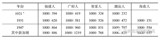 英屬馬來(lái)亞華人主要是福建人、廣府人、客家人、潮汕人和海南人,最大方言群是閩南人,其次是廣府人、客家人、潮汕人,海南人最少。相應(yīng)地,華人婦女也以閩南人為最多,海南人最少,但從各方言群男女比例來(lái)看,廣府人女性占比最高。1921年人口普查表明,廣府人男女比例為1000∶419,福建人為1000∶394,客家人為1000∶324,潮汕人為1000∶232。20世紀(jì)30年代女性移民浪潮大大提高了各方言群的女性占比,廣府人女性占比提高最快,1947年廣府人男女比例為1000∶960,其中新加坡的廣府婦女甚至超過(guò)廣府男性,男女比例為1000∶1219。福建人男女比例上升為1000∶864,客家人男女比例上升到1000∶831,潮汕人男女比例為1000∶797,海南婦女人數(shù)仍然最少,但增長(zhǎng)迅速,海南人男女比例上升到1000∶554(見表3)。