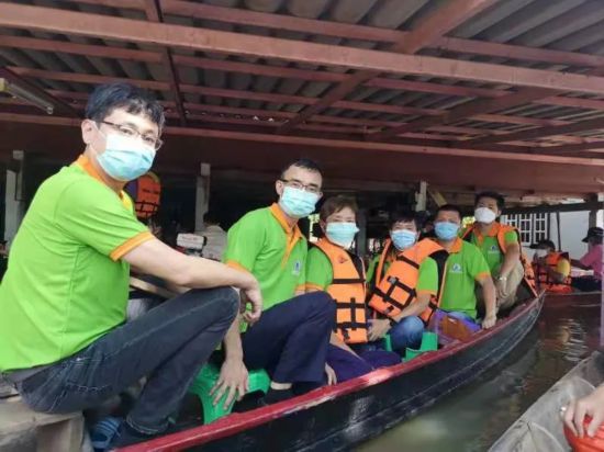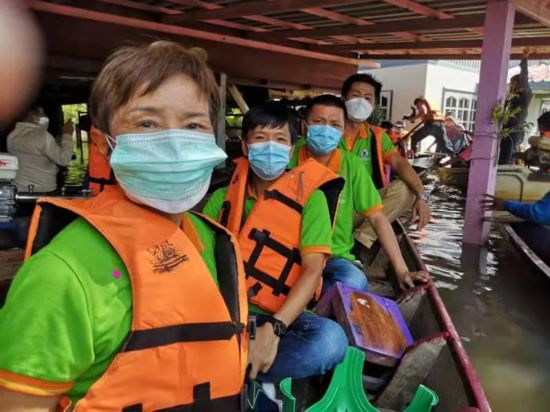 泰國(guó)泉州晉江聯(lián)合總會(huì)會(huì)長(zhǎng)蔡上新、執(zhí)行會(huì)長(zhǎng)陳俞龍、副會(huì)長(zhǎng)許清流、洪世界、張孚杰、常務(wù)理事黃淑芬、顧問許宗會(huì)乘小船進(jìn)入災(zāi)區(qū)