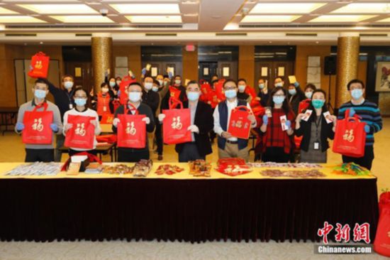 資料圖:中國駐紐約總領(lǐng)館向留學(xué)生、華僑發(fā)放“春節(jié)包”。