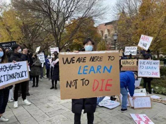 11月16日,以中國留學(xué)生為主的數(shù)百名芝加哥大學(xué)學(xué)生、教職員以及家長,在芝大校園舉行“我們要安全”游行集會,高呼“我們是來這里學(xué)習(xí),不是來送死”“誰是下一個?”“停止槍支暴力”等口號,向校方強烈要求確保校園安全。