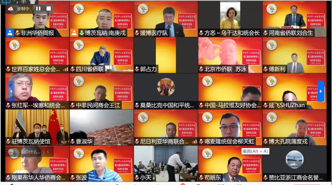 第三屆非洲華僑華人民間外交論壇以線上線下相結合的方式舉行。中華人民共和國駐博茨瓦納特命全權大使王雪峰,黑龍江、北京、四川和河南等省市僑聯(lián)領導,全國友協(xié)、中非民間商會負責人和非洲研究專家學者出席論壇。論壇圍繞“華僑華人和國家形象”主題,就團結抗疫、中非合作、綠色發(fā)展、在非中國企業(yè)社會責任、反對種族主義和維護中國和平統(tǒng)一等領域相關議題,開展了富有建設性的對話,共同總結中國民間外交的實踐經驗與理論成果,探索中非民間外交發(fā)展的新思路、新方法,從而多層次、多方位、全方位地推進新時代中國特色大國外交的發(fā)展。會議最后還通過了《2021 中非民間外交倡議書》。