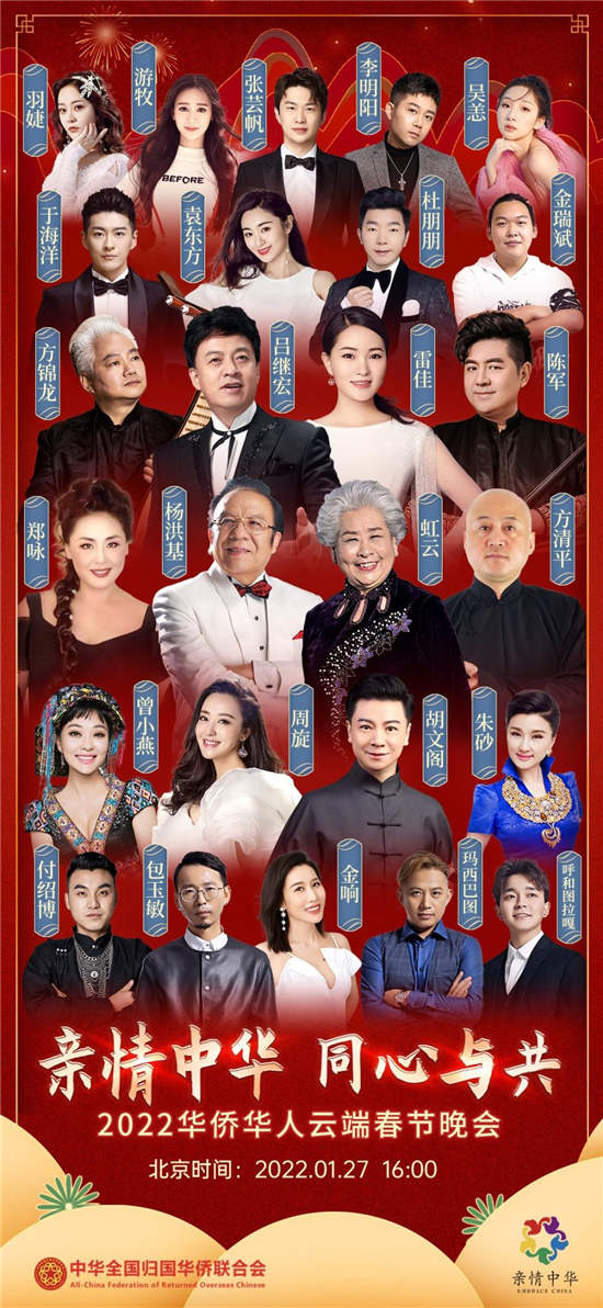 “親情中華·同心與共”2022華僑華人云端春節(jié)晚會將于北京時間2022年1月27日16:00盛大開啟!屆時將在學習強國、央視頻、中國網(wǎng)、愛奇藝國際版、騰訊視頻、華人頭條等20余家平臺同步直播!