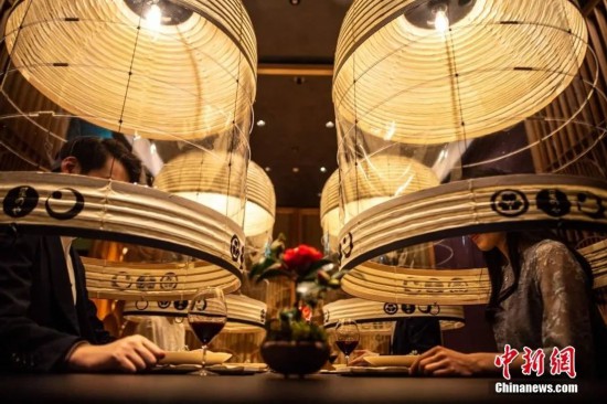 當(dāng)?shù)貢r間2月28日,日本東京一家酒店設(shè)置的用餐防護罩,旨在疫情期間保持安全社交間距。圖源:視覺中國