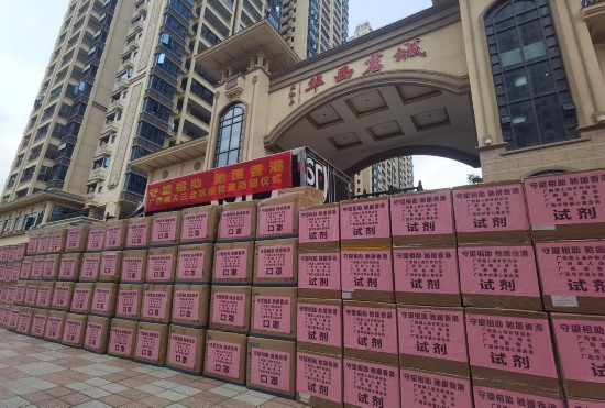 共有2萬人份的新冠檢測(cè)試劑、11萬個(gè)KN95成人口罩、1.1萬個(gè)兒童口罩等抗疫物資通過專車運(yùn)往香港。