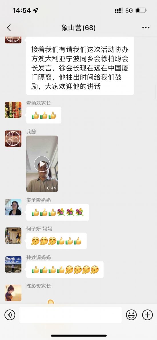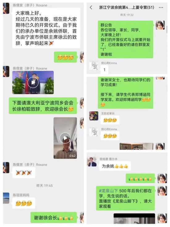 澳大利亞寧波同鄉(xiāng)會(huì)會(huì)長(zhǎng)徐柏聰和澳大利亞新金山中文學(xué)校校長(zhǎng)胡培康也分別寄語(yǔ)參營(yíng)學(xué)員,鼓勵(lì)學(xué)員們通過(guò)網(wǎng)上夏令營(yíng)的學(xué)習(xí)了解中國(guó)國(guó)情,感知中華文化,希望各位華裔青少年在活動(dòng)中學(xué)有所思、學(xué)有所獲、學(xué)有所成、學(xué)有所用,在領(lǐng)略中華文化、浙江文化、寧波文化中,做中澳文化交流的友好使者。