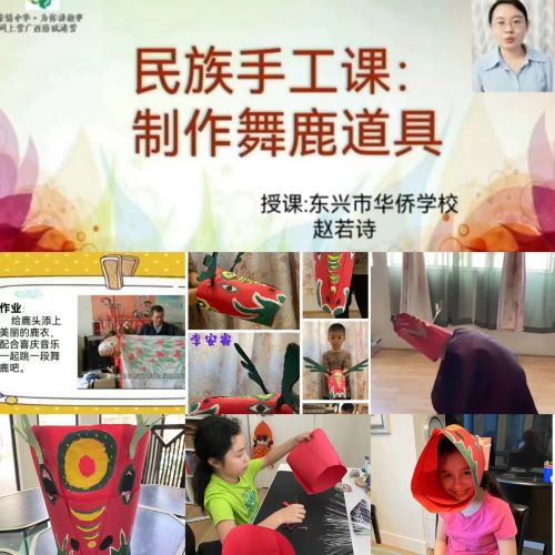 直播課上,營員們通過老師的講解,了解到“舞鹿”文化是上思?jí)炎鍍和磕贽r(nóng)歷“三月三”進(jìn)行的一種民俗傳統(tǒng)活動(dòng),寓意祈禱家人健康長壽、福祿綿延。“舞鹿”表演時(shí),鼓、镲和鑼等樂器敲打出的音樂節(jié)奏明快強(qiáng)烈,營員們紛紛用手跟著打起了節(jié)拍,還有營員大膽發(fā)揮想象,巧用生活用品表演了“舞鹿”的節(jié)奏。在老師的指導(dǎo)下,營員們親自動(dòng)手制作了“舞鹿”的道具——鹿頭,還用自己制作的道具進(jìn)行了“舞鹿”表演,全身心沉浸在歡樂的節(jié)奏中。