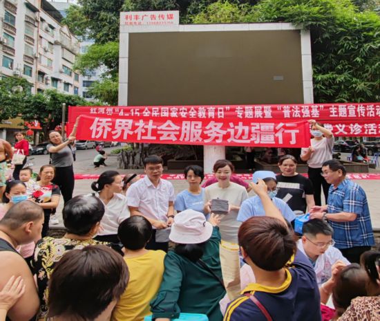 醫(yī)務(wù)人員為僑界群眾量血壓、查病情、開藥方;致公黨干部為僑界群眾找藥送藥;州縣僑聯(lián)干部開展涉僑法律法規(guī)講解,并向群眾發(fā)放普法宣傳手冊及宣傳單。整個服務(wù)活動場景熱情與和諧、親切與融洽交織在一起,體現(xiàn)了為僑服務(wù)宗旨,也增進了干群關(guān)系與感情。