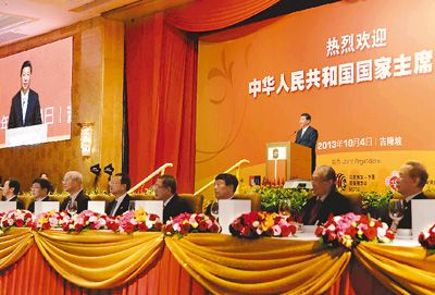 10月4日,正在馬來西亞進行國事訪問的國家主席習近平和夫人彭麗媛在吉隆坡出席馬來西亞各界華僑華人歡迎午宴。這是習近平主席在歡迎午宴上致辭。