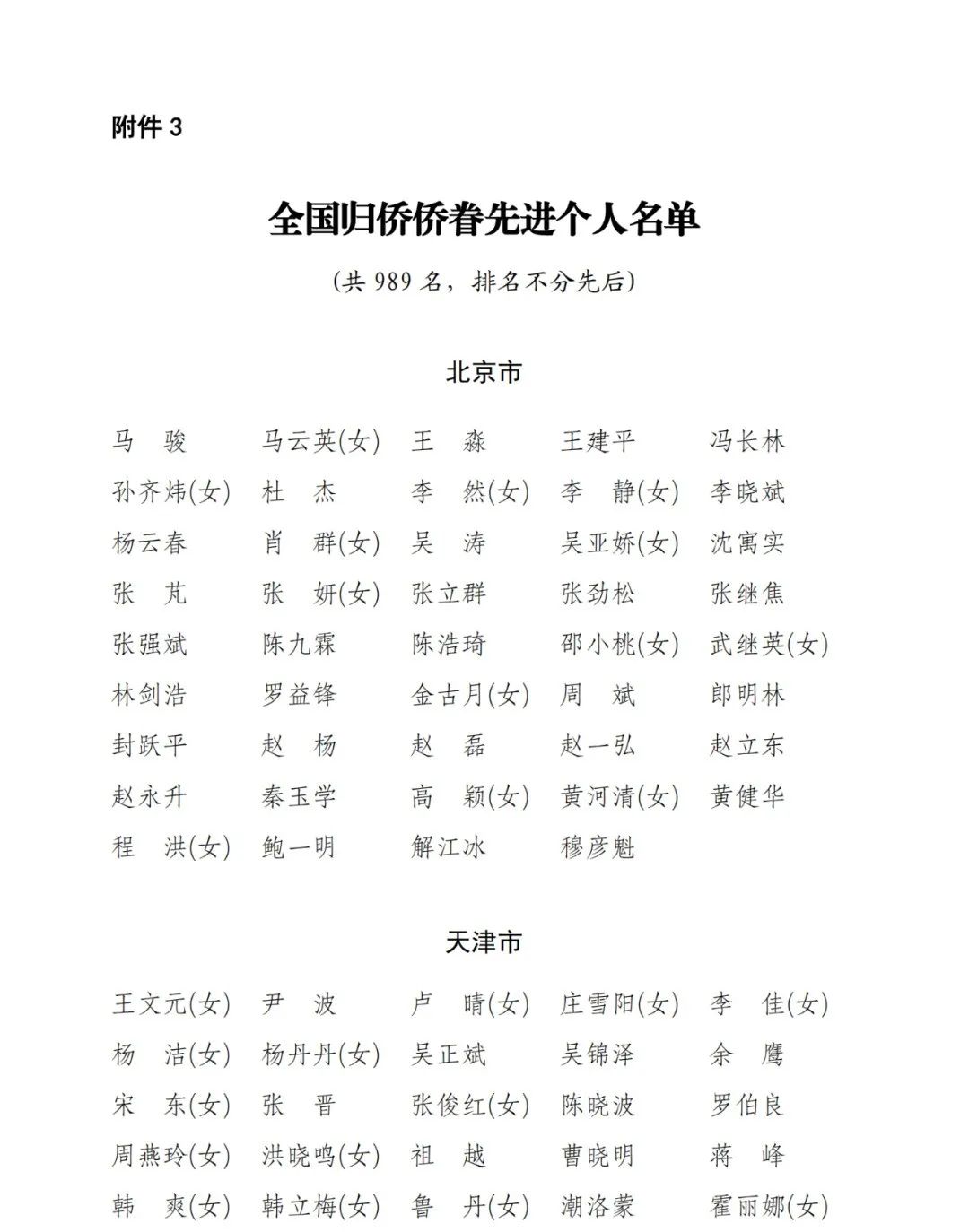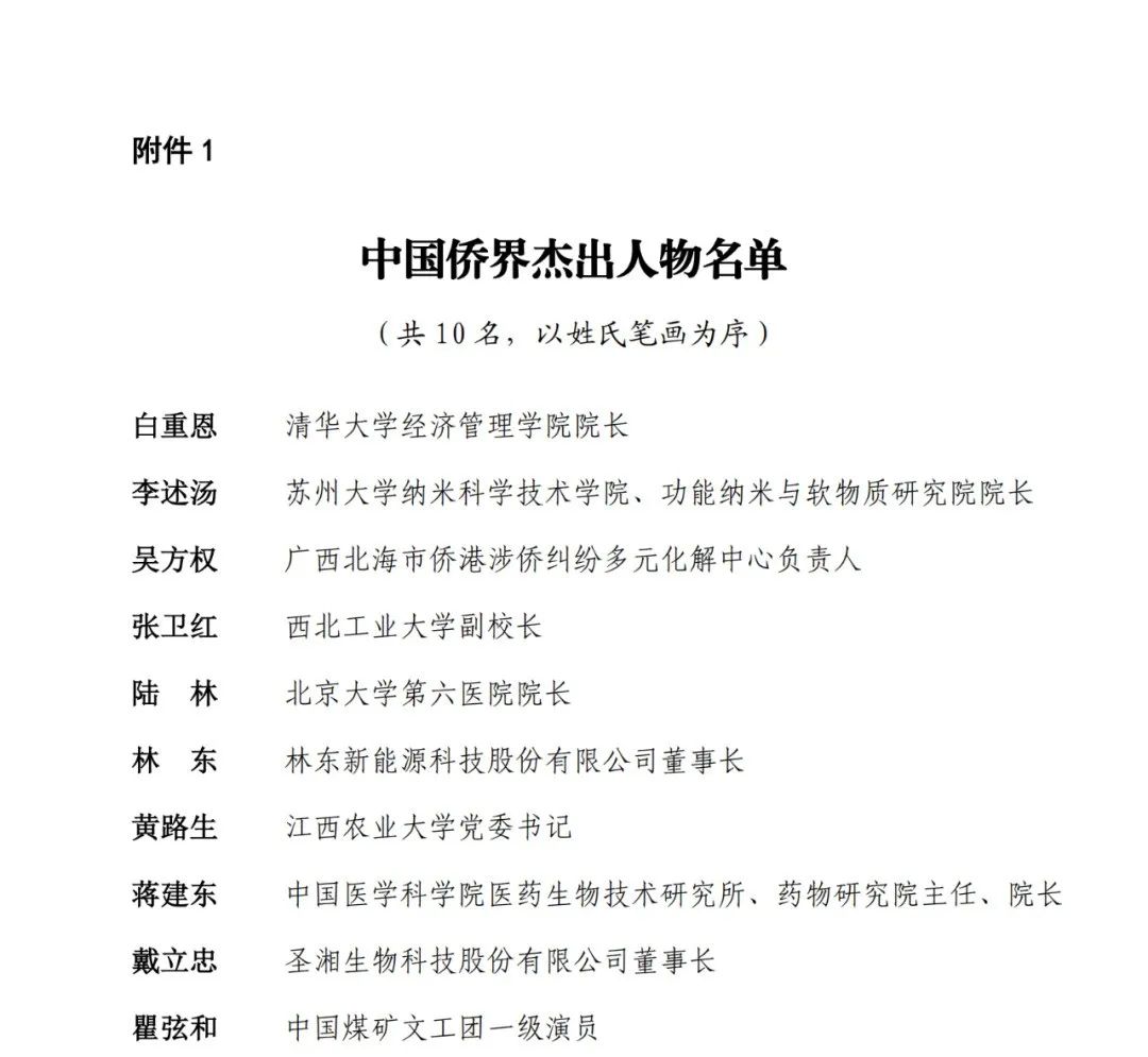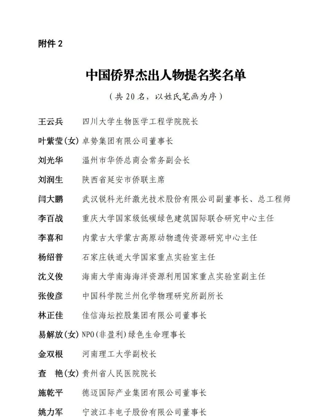 為大力弘揚廣大歸僑僑眷的拼搏進取和愛國奉獻精神,宣傳他們立足本職、建功立業(yè)的先進事跡,中國僑聯(lián)、國務(wù)院僑務(wù)辦公室決定:授予白重恩等10名同志“中國僑界杰出人物”榮譽稱號;授予王云兵等20名同志“中國僑界杰出人物提名獎”榮譽稱號;授予馬駿等989名同志“全國歸僑僑眷先進個人”榮譽稱號。希望受到表彰的同志珍惜榮譽,再接再厲,努力在新時代新征程上再創(chuàng)新業(yè)、再立新功。