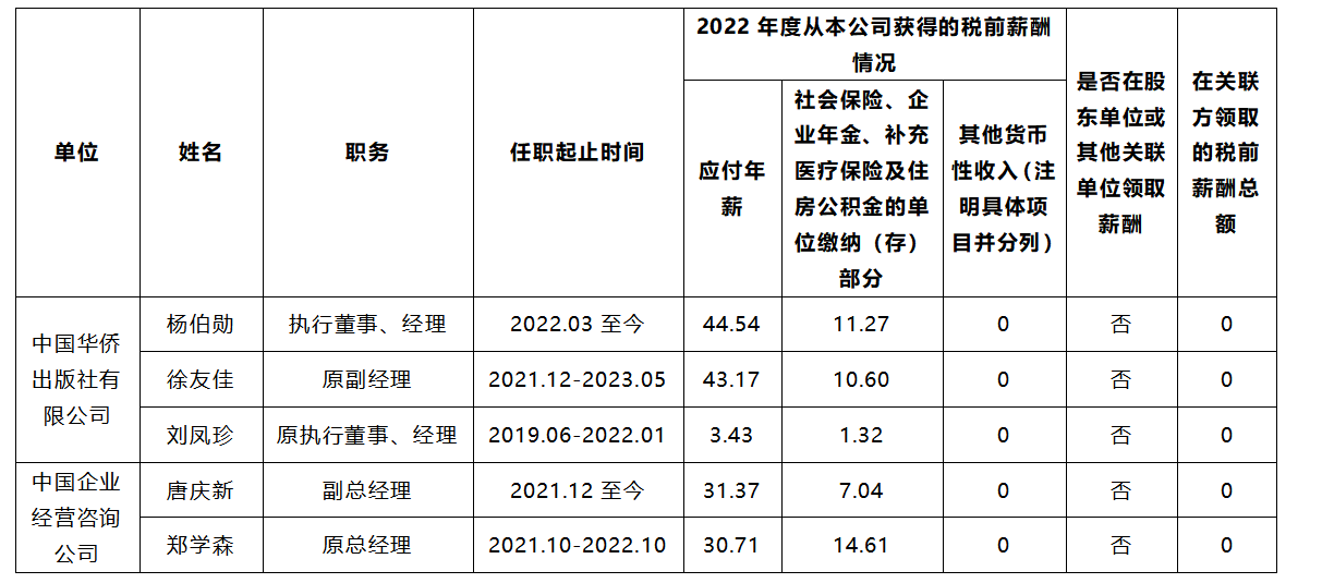 備注:上表披露為我會所屬企業(yè)負(fù)責(zé)人2022年度全部應(yīng)發(fā)稅前薪酬(不含發(fā)放的以往年度績效年薪)。