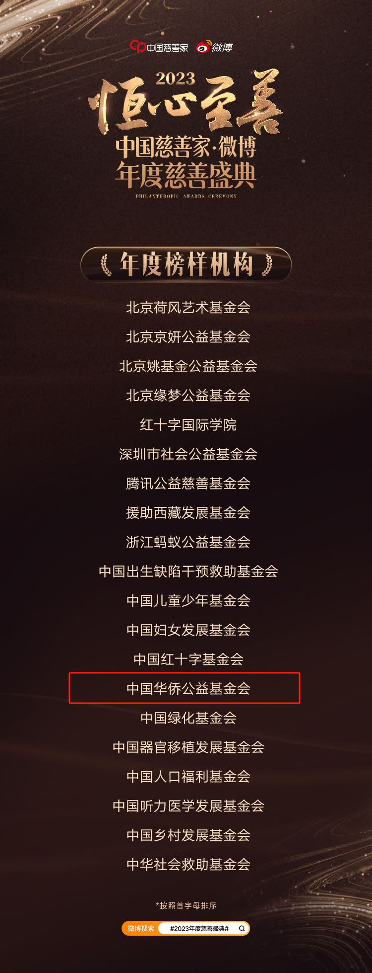 1月8日,由《中國慈善家》雜志和微博共同主辦的“恒心至善”2023年度慈善盛典,在北京國際會議中心隆重舉行。中國華僑公益基金會榮獲2023年度慈善盛典年度榜樣機構(gòu)。
