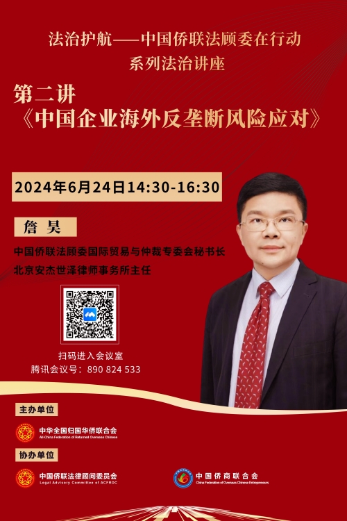 第二講將于6月24日14:30開(kāi)播,由中國(guó)僑聯(lián)法顧委國(guó)際貿(mào)易與仲裁專委會(huì)秘書長(zhǎng)、北京安杰世澤律師事務(wù)所主任詹昊律師主講,題目是《中國(guó)企業(yè)海外反壟斷風(fēng)險(xiǎn)應(yīng)對(duì)》。聽(tīng)課鏈接參見(jiàn)下方海報(bào)。