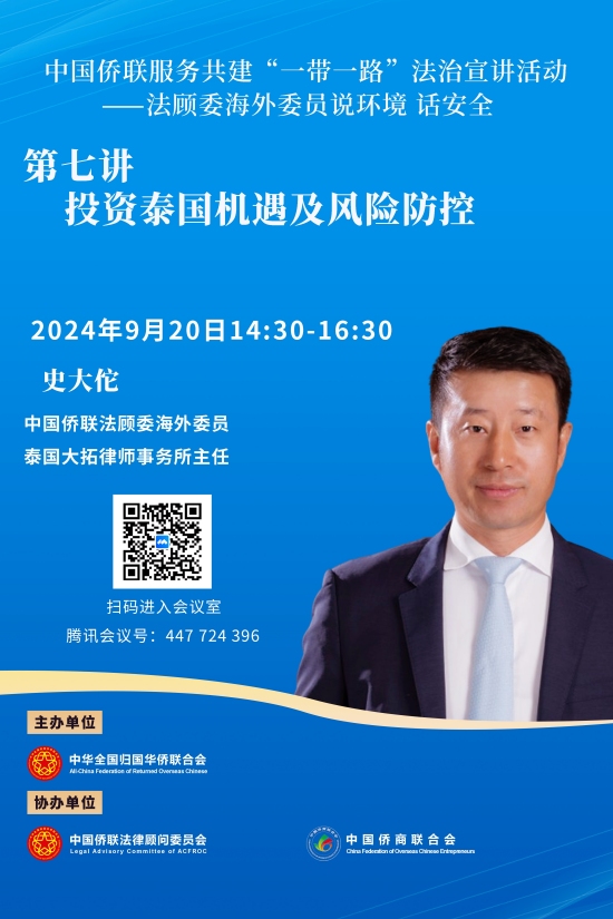 第七講將于2024年9月20日(周五)14:30開播,由中國僑聯(lián)法顧委海外委員泰國史大佗律師主講。史大佗律師畢業(yè)于英國倫敦城市大學(xué),主修國際商法,于2014年在泰國創(chuàng)辦泰國大拓律師事務(wù)所并任主任,同時擔(dān)任泰國中華總商會常務(wù)會董兼法律顧問、泰國中國企業(yè)總商會副主席兼法務(wù)部主任、泰國山東總商會會長。史大佗律師為超過1400家中資企業(yè)提供過法律服務(wù),熟悉投資泰國路徑和框架搭建,以及如何避免投資誤區(qū)。