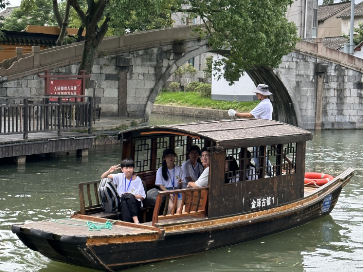 位于青浦區(qū)的金澤古鎮(zhèn),是典型的江南魚米水鄉(xiāng)。鎮(zhèn)上至今還保存著宋元明清所建的七座古橋梁。營員們來到金澤古鎮(zhèn),在云煙氤氳中體驗(yàn)江南的水鄉(xiāng)文化,在煙波浩渺中感受傳統(tǒng)手工工藝的魅力。搖櫓起行,水波搖動,營員們坐在古色古香的小舟上,領(lǐng)略兩岸風(fēng)光,盡賞古橋風(fēng)韻。游船上,營員們紛紛拿出手機(jī)拍照留影。