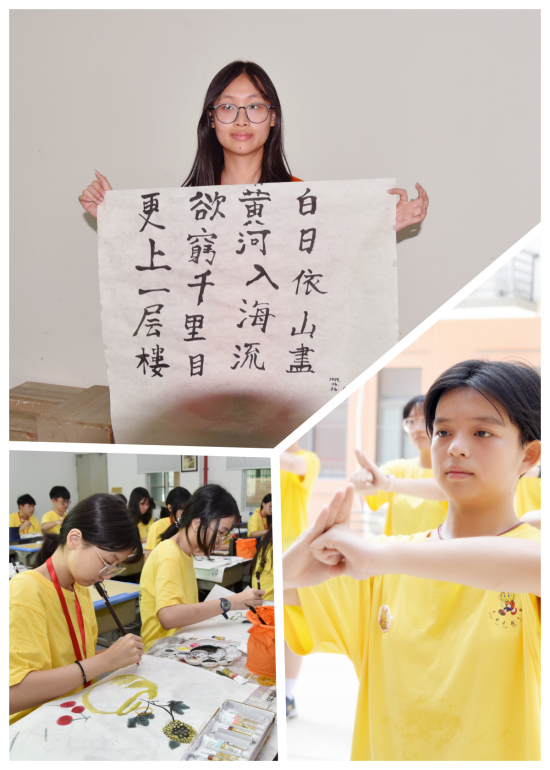 印尼營員陳建元開心的說“我以前學(xué)過武術(shù),這次體驗(yàn)了中華武術(shù)課,感覺非常神奇?!边@是他第一次來到福建,感覺很有趣,很開心有機(jī)會(huì)能深入了解中國文化?!皶ê蛧嬚n很有意思!”熱愛中國傳統(tǒng)文化的黃莉娜對(duì)于剪紙、書法、國畫等課程尤為喜歡,第一次上書法課的她在老師的指導(dǎo)下完成了王之渙的《登鸛雀樓》,老師和同學(xué)們都為她點(diǎn)贊,她開心地表示,一定要把這幅作品帶回印尼,當(dāng)作禮物送給爸爸和媽媽。