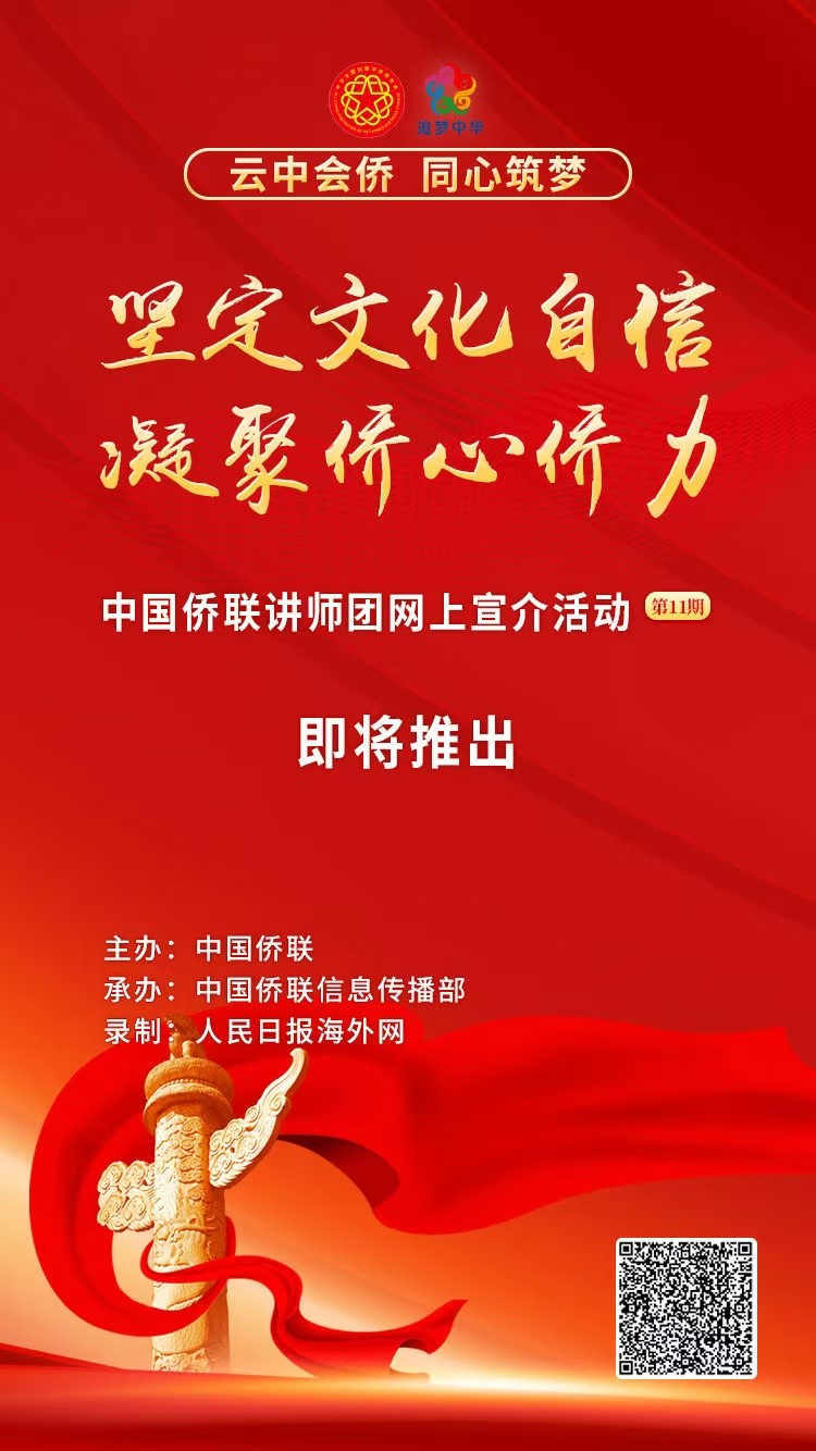 為深入學(xué)習(xí)貫徹習(xí)近平文化思想,錨定建成文化強(qiáng)國的戰(zhàn)略目標(biāo),堅定文化自信,不斷發(fā)展新時代中國特色社會主義文化,不斷提升中華文化影響力,筑牢強(qiáng)國建設(shè)、民族復(fù)興的文化根基,激勵僑界群眾在奮進(jìn)新征程中作出新貢獻(xiàn),中國僑聯(lián)精心策劃錄制并即將推出講師團(tuán)網(wǎng)上宣介(第十一期)視頻。
