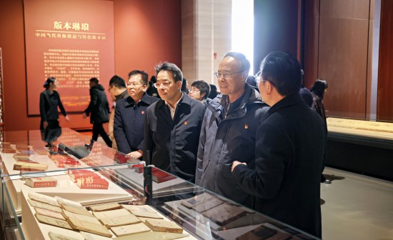 在講解員的引導(dǎo)下,萬立駿一行先后走進(jìn)國家版本館文興樓、文華堂、文瀚閣、蘭臺(tái)洞庫等,參觀了“版本工藝”專題展、“斯文在茲——中華古代文明版本展”、“版本琳瑯——中國當(dāng)代出版精品與特色版本展”與“真理之光——馬克思主義中國化時(shí)代化經(jīng)典版本展”等專題展覽陳列,認(rèn)真聆聽現(xiàn)場講解,頻頻駐足陳列柜前,仔細(xì)閱覽陳列展品,近距離領(lǐng)略典籍、版本凝聚的文化血脈和寄托的民族理想,深刻體悟到版本背后強(qiáng)大的文化生命力、文化感召力,感受馬克思主義中國化時(shí)代化的光輝歷程,真切感受到中華文化的深厚底蘊(yùn)和中華文脈的時(shí)代價(jià)值。在參觀過程中,大家不時(shí)為中華民族博大精深的文化而感慨贊嘆。