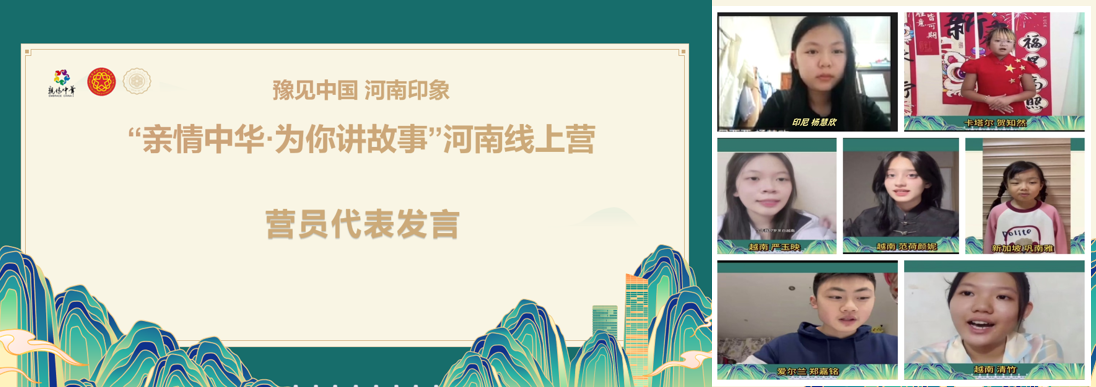 本次網(wǎng)上營以“豫見中國·河南印象”為主題,精心設(shè)計“豫見中華始祖-軒轅黃帝、豫見中國古都-商城鄭州、豫見中國字-漢字起源、豫見中國茶-信陽毛尖、豫見中國美食-豫食文化”等課程,活動采取直播+錄播+回放相結(jié)合的形式,以文化為橋梁,以故事為媒介,跨越地理界限,將中國和河南的悠久歷史、燦爛文化、自然美景和現(xiàn)代發(fā)展,通過屏幕傳遞到世界各地。